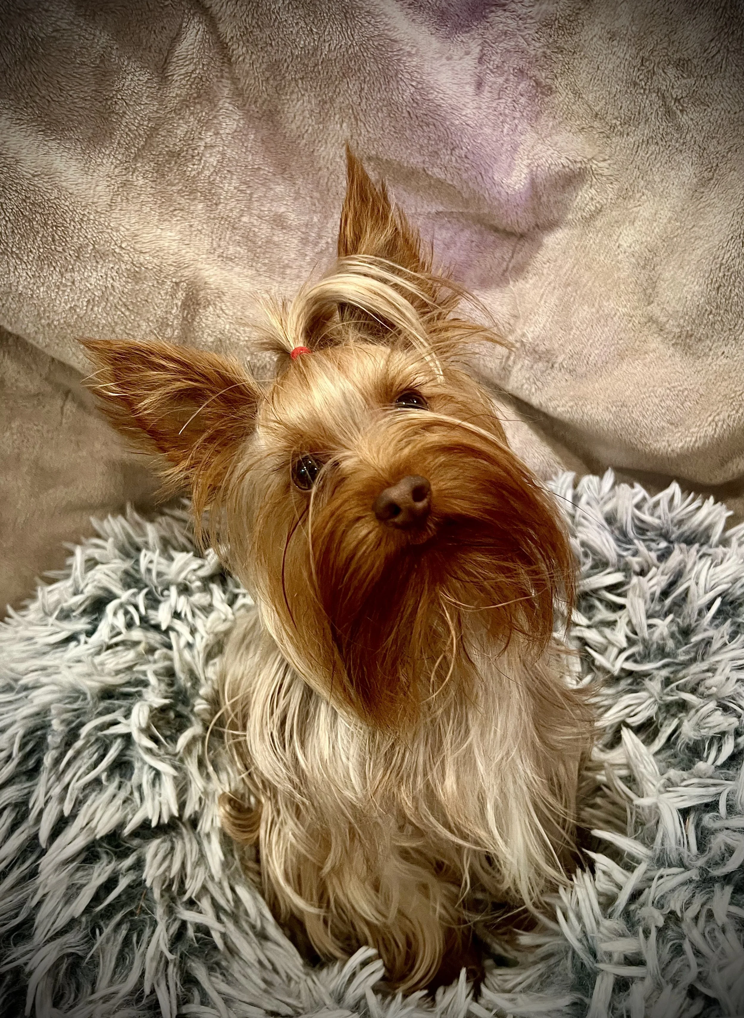 Queen Bea is a majestic Red Leg Yorkie! Bea is always on patrol to keep the squirrels out of her yard, and off her fence! When she is not on patrol Bea is queen of naps, beds, and well the whole house! Bea loves toys that squeak, ducky toys, treat time, and playing chase with all her Yorkie friends.