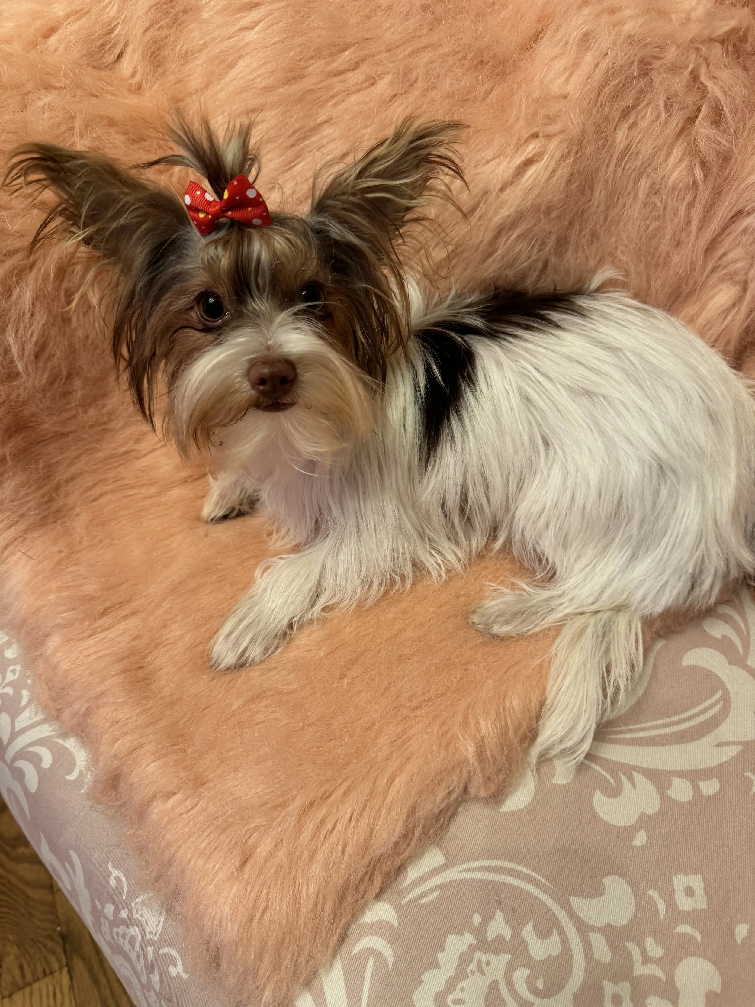 Lady Lulu is a small quiet girl who rather be in her bed than outside. Lulu is an AKC registered Parti Yorkie having a thick cotton coat of White, Black, and Tan. She is one of our smallest females and if you are looking for a TikTok “Tiny” Yorkie her babies are small and petite.